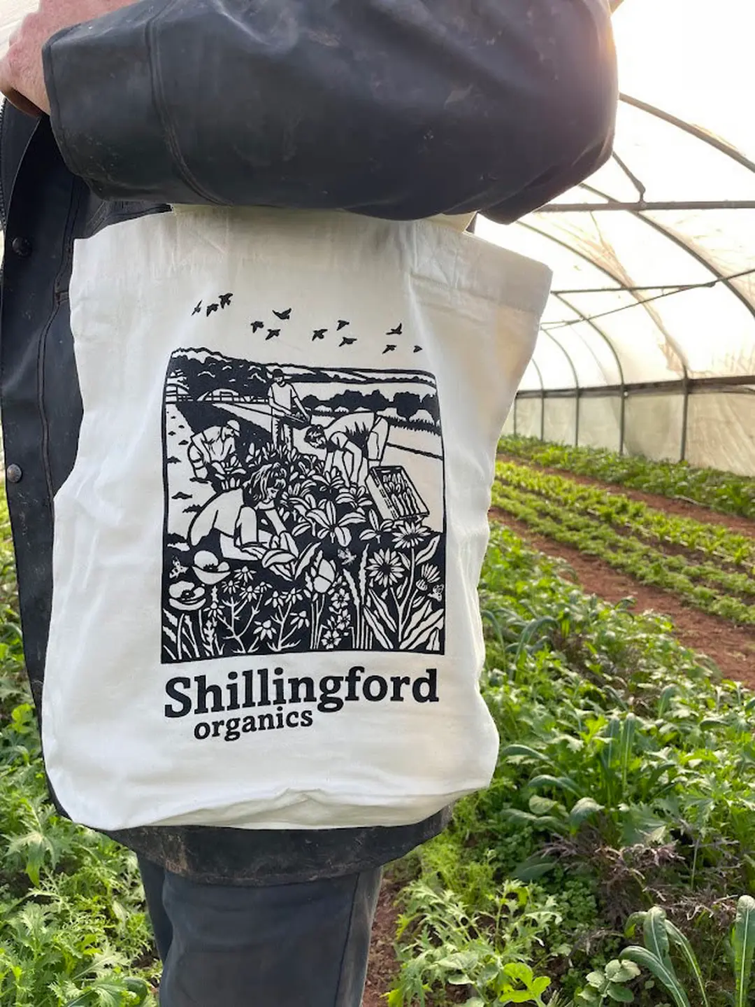 Organic cotton tote bag featuring a print of our farm by Polly Meyrick